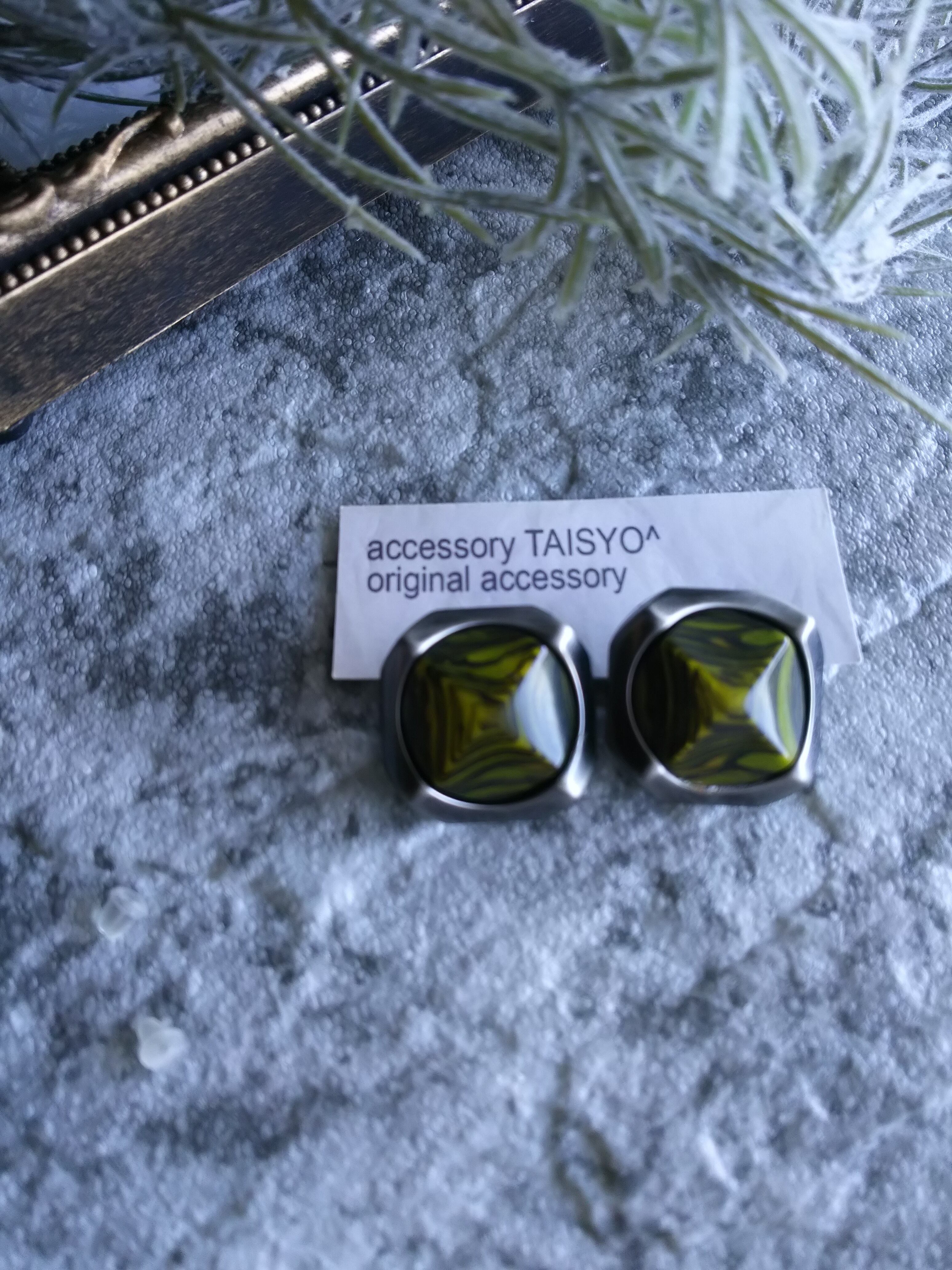 シルバーの縁にくすんだ黄緑色のマーブルカラーのヴィンテージボタンを使用しています。